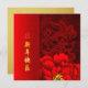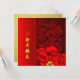Design of stylised red Chinese peony + red Rabbit paper-cut (image printed) with radishes + Happy New Year in Chinese and English + customisable 2023 onto a decorated red background with auspicious clouds. Design on square flat card invitation. Matching square red envelope and sticker. Perfect for Chinese New Year of the Rabbit 2023.