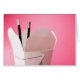Ask your friend to meet you for Chinese food with this pretty photo of a takeout box and black chopsticks with a bright pink background.