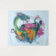 A Chinese green and purple water dragon with an orange koi fish, lotus flowers, cherry blossoms water against a backdrop of blue