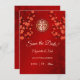 Red cherry blossoms and a gold double happiness symbol on a shimmering red floral background. Save the date text in an elegant font. Matching Chinese wedding products available.