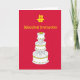 A multi tiered wedding cake decorated in golden icing flowers and swirls. The cake is against a deep red background and along with the Chinese symbol for double happiness says 'Wedding Invitation'.