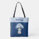 This cute cottagecore style tote bag features large mushroom decorated in in blue floral Chinoiserie pattern on a dark Navy background. The top is trimmed in light blue, with your recipient's monogram name in a script font in Navy. Make sure to type the name you want in the Personalize section. The design is the same on both sides.