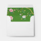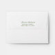 Personalised , chinoiserie pattern lined interior with dark green return address on back flap note card envelope.