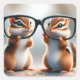 Two adorable chipmunks are playfully holding up a pair of oversized glasses