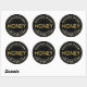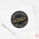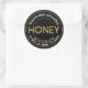 Label your own honey, candles, beeswax and more with this modern black and metallic gold honey sticker. Personalise with your apiary business name at the top and add in your location or and NET WT below. The word HONEY is printed with a raised-look in a shiny metallic gold "chiseled" font that almost appears as if it is coated with honey. The centre of the letter "O" in HONEY is filled with honeycomb.