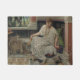 This design features a painting by the English artist Sir Edward John Poynter (1836–1919), who served as President of the Royal Academy of Arts. It depicts a beautiful woman named Chloe who is seated in an elegant portico surrounded by ancient-Roman architecture. She is holding a pair of woodwind musical instruments, like flutes, in one of her hands, and she is holding cherries in the other hand to tempt a small bird that is perched nearby. Chloe is wearing a long flowing toga-like dress and she has green sandals on her bare feet. She has neat brunette hair and she is wearing a colourful necklace. The architecture that surrounds her is painted in all kinds of beautiful colours. There are some tall flowers, including foxgloves and poppies, growing in the garden outside. The coast and the sea can be seen in the distance. The original artwork was painted by Edward Poynter in 1893.
