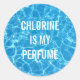 Chlorine is my perfume is text in white on a beautiful sparkling blue, clear pool water.