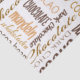 This tissue paper features a word cloud of chocolate, dark chocolate, almonds in English, German and French plus other words in a variety of font styles, sizes and colours. Great for most gift wrapping occasions. Select from 2 paper styles, and 7 sizes.