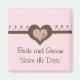 Elegant design in chocolate brown and dusty pink with heart and elegant scroll design. Remind friends and family to save the date for your big day!