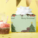 Destei's original cartoon illustration of a cute chocolate brown coat colour Labrador Retriever breed dog. The dog is standing by a festive Christmas tree decorated with red and yellow ornaments, a white pearl garland and a yellow star that is placed on the top of the tree. There are also two wrapped presents by the tree and there is a personalizable text area that now reads: "Merry Christmas!". The background colour is light green.
