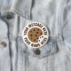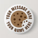 Chocolate chip cookie pin buttons with custom text. Personalised with your name or quote. Modern round design. Cute cookie logo with bite taken out and crumbs. Great for Birthday, baking event and more.