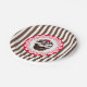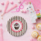Chocolate Cupcake with Cherry birthday party Paper Plates with tan and white stripes and red whimsical lacey accents.