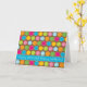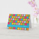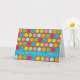 This birthday card design features colourful dots with contrasting outlines on a chocolate brown background. Blue stripe across lower card features funky text that says "Happy Birthday! Happy Birthday!"
