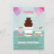 What a sweet party celebration! This invitation has a three tier chocolate fondue fountain centrepiece with a variety of dipping items like fruits cut in bite size shapes strawberries, grapes, orange, kiwis, marshmallows, wafer roll, chocolates, cakes and candies. Background of colourful balloons in hues of pink and purple. This design is perfect for teen birthday girls and even adults with a sweet tooth who simply loves chocolates and candies! Personalise easily with your party details.