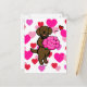 Cheery and smiling Chocolate Labrador is holding Pink Rose Bouquet! Girly pink hearts background. Unique and funny Labrador Retriever Art painted by Naomi Ochiai from Japan. Send this card to your people who own Chocolate Labradors. Nice for Valentine's Day.
