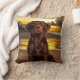 A chocolate Labrador Retriever sits on a sandy beach, gazing intently at the camera. The dog's fur is a rich brown, contrasting with the golden hues of the setting sun. The sky is ablaze with vibrant orange and pink clouds, reflecting in the wet sand. The ocean waves gently lap at the shore, creating a tranquil and serene atmosphere. Ideal gift for labrador lovers.