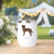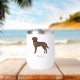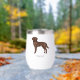Destei's original cartoon illustration of a chocolate brown colour Labrador Retriever breed dog. The dog has a kind face expression that is framed by her large floppy ears. The dog design pictures the dog from the side while standing. The dog's head is turned the viewer of the image. There is also a personalizable text area for a name or other custom text.