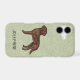 Destei's original cartoon illustration of a chocolate brown colour Labrador Retriever breed dog. The background colour is green with a decorative texture. The background colour can be changed to any other colour and the texture can be removed, if so wished. There is also a personalizable text area for a name or other custom text.