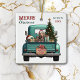 A teal blue retro pickup truck carries a decorated Holiday tree and gift packages on this cute ceramic Christmas ornament. Looking out from the tailgate is a chocolate brown Labrador Retriever dog wearing a red and white Santa Claus hat. A rustic wooden sign on the back bumper says "Christmas Cheer". The red and green stylised text at the top left says "MERRY CHRISTMAS", with your name (or your dog's) and the year at the right. Both sides have the same image.