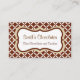 A vintage chocolate brown and white pattern decorates this stylish business card. Customise this business card to suit your needs. Add or delete information, change the font style, font size, etc...The design is from original art. Use this stylish business card for a spa, salon, small business, home decor, event planner, bakery, candy shop, chocolatier, ice cream shop, coffee shop, cafe, etc...