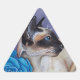 Original watercolor painting by Sandra Gale, featuring a chocolate point Siamese cat, surrounded by blue flowers on a pale purple background. Flowers are blue hydrangea, and blue poppies and a blue rose. Great design for cat lovers and those who especially like the Siamese breed. Perfect for bedroom wall art or framed with matching image. Matching watercolor painting of a blue point Siamese also available in my EverIrisPrints store.