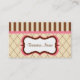 This cute business card has vintage style. Customise this argyle business card to suit your needs. Add or delete information, change the font style, font size, etc...The design is from original art. Use this stylish business card for a spa, salon, small business, home decor, coffee shop, gourmet chocolates, ice cream shop, nail salon, inn, cosmetologist, preschool, hair stylist, event planner, child care, daycare, bed and breakfast, boutique, bakery, etc...
