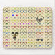 A pattern of rows and rows of eyeglass frames on a light yellow background. Colourful, or silly -- Which one to choose? This playful design pokes a little fun at the process of choosing frames. I created it from images of eyeglass frames I collected from various places on the internet. I arranged them in rows and then added a light yellow background for a retro mood.