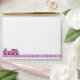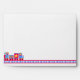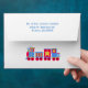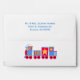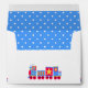 Colourful choo choo train themed baby shower invitation envelope. The outside of the envelope is white, with cute graphics of a blue, red, green, and yellow toy train, on the front and back of the envelope, with the inside done in a blue and white polka dot pattern. Personalise the blue return address, on the back flap of the envelope. Matching baby shower products are available.