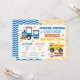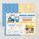 Bright stars, bold blue and gold accents, and a cheerful zigzag border make this invite ideal for a shared birthday celebration for siblings, twins, or best friends. The combination of a cute train and construction truck creates a unique two-theme party invitation that works perfectly for boys or any child who loves transportation and construction.