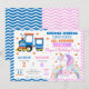 With colorful stars, sweet heart details, soft watercolor elements, and a cheerful blue and pink zigzag border, this invitation is ideal for a joint birthday party, boy & girl shared birthday, train and unicorn theme, transportation and fantasy party, editable kids birthday invite, and two-theme birthday celebration.