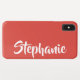 This modern, trendy, bold case for the iPhone XS, XS Max, XR is solid fiesta red with giant sized white script text. Simple and elegant! Easy to choose a different colour (choose "customise" and select background colour). Also easy to personalise example name. Select either Casemate Barely There Commuter or Tough Series. All Rights Reserved © 2018 Alan & Marcia Socolik.