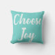 Trendy throw pillow features "Choose Joy" modern casual script font in white on aqua background.