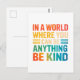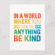 Brighten the world with kindness through this cheerful "In A World Where You Can Be Anything, Be Kind" postcard, illustrated in vibrant, colourful lettering. This uplifting and motivational artwork promotes positivity, empathy, and compassion, making it a perfect design for spreading good vibes wherever you go. Ideal for teachers, students, mental health advocates, or anyone who believes in kindness as a superpower.