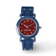 This fun kids wrist watch with a blue silicone strap can be customised as you wish. You can CHOOSE YOUR OWN COLOR to replace the background on the watch face and you can make the text say whatever you want. Or keep my burgundy and white design. All Rights Reserved © 2023 Alan & Marcia Socolik.