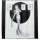 This is an elegant and glamourous art deco illustration of a young blonde woman (that appears to be Betty Davis), in two piece white silk evening dress that flow all the way to the floor trailing her feet by about a yard.