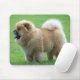 This fun canine mousepad features fluffy creamy tan Chow Chow puppy dog sticking out her black tongue highlighted against a green grass background.