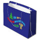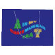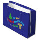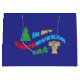 This Chrismukkah gift bag features a Christmas tree and a menorah. The words, "In My Chrismukkah Era" appear on the bag. The design appears on both sides of the bag with a dark blue background. Copyright Kathy Henis