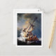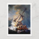Jesus and his disciples on the Sea of Galilee. Jesus rests in the boat during a storm. The men become afraid and question if he will save them. Fine art Rembrandt.