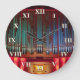 Roman numerals in white lettering on top of the blue, green and red colours of the pipes and case of the Rieger organ in the Christchurch Town Hall, New Zealand.