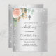 A faux silver looking background decorated with eucalyptus greenery, a rose gold and blush pink rose, and golden leaves and faux silver glitter drops. A silver cross. Personalise and the childs name and ceremony details.