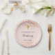 A blush pink background. Decorated with rose gold confetti and a faux gold cross. Personalise and add a name and a date.