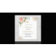 A white background decorated with eucalyptus greenery, a rose gold and blush pink rose, and golden leaves and faux gold glitter drops. Personalise and the childs name and ceremony details. Black and golden coloured letters.