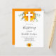 A white background decorated with a white cross, watercolored sunflower, eucalyptus greenery and golden leaves. Personalise and the childs name and ceremony details. Gender neutral.