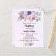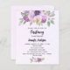 A violet, lavender watercolored background. Decorated with violet and purple watercolored flowers and greenery and a golden cross. Personalise and add a name and reception details.