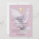 A beatiful celebration of life invitation featuring a flying dove with a gold cross on a lavender background , on the back of the invitation theres a photo template where you can add a photo of the person that your celebrating and create a beautiful keepsake for the invitees to treasure forever.