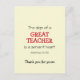 This is a simple, modern THANK YOU CARD with an inspirational message based on the Bible Scripture verse from Matthew 20:26, which says THE SIGN OF A GREAT TEACHER IS A SERVANT HEART, with additional text at the bottom that says THANK YOU FOR YOURS. The text for GREAT TEACHER and the THANK YOU message are both CUSTOMIZABLE, so you can change the role (eg. MENTOR, PROFESSOR, LECTURER, etc) and the greeting/name as required. The reverse message is also customisable, so you can edit or delete and add your own personal message. This would make a great TEACHER APPRECIATION greeting postcard for your favourite teacher, either at Christmas or at end-of-year to say Thank You. With customisation you could also change it for NURSE or DOCTOR, etc.