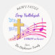 Christian HALLELUJAH CHRIST IS RISEN Easter Sticker, showing a gold colored empty cross in amongst colorful music staves. The Easter text appears in a mauve color. These words will be sung by Christians the world over to celebrate the resurrection of our Lord Jesus Christ at Calvary. You can switch out the HAPPY EASTER and name for your choice of wording. This modern Christian Easter Sticker would make a great finishing touch to Easter gifts to celebrate Resurrection Sunday. Choose from a wide selection of faith-based Christian Easter designs on cards, invitations, home decor, clothing and gifts, designed by Berean Designs. Card and invitation versions of this Easter design are listed separately. Matching gifts available.
