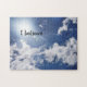 Christian theme jigsaw puzzle for adults designed for God fearing people who are believers designed with a brightly sunlit sky with light beams and the words I Believe.