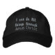 Shown in black with a embroidered stitch of silver and light green. This cap has front text only. Adjustable back.