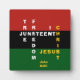 Stylish Pan African JUNETEENTH plaque with Christian Bible reference, showing the inspirational quote TRUE FREEDOM IN CHRIST JESUS in a crossword format including JUNETEENTH, and is set against red, black and green panels (colours of the PAN AFRICAN FLAG). The main text is based on the Scripture reference from John 8:36 - HE WHO THE SON (JESUS) SETS FREE IS FREE INDEED. The Bible reference JOHN 8:36 is customisable, so you can replace the text with your MONOGRAM. This Juneteenth plaque would make an ideal gift for Juneteenth, Black History Month, Christmas, Birthdays and throughout the year. Be prepared to share your faith, as this would also make a great conversation starter.